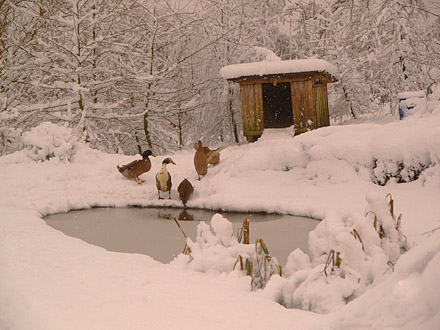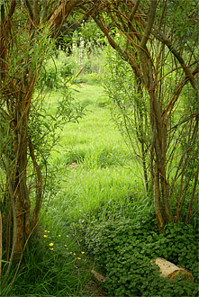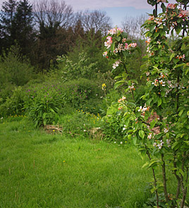 The three years observation paid off and informed our design well, as now the site is very sheltered whilst retaining plenty of open, sunny areas for relaxation and tender crops, with the broad pattern of forest garden over the whole plot. Special attention was given to linking existing wildlife corridors e.g. to the woods and mature hedgerows; and to creating microclimates of sun and shade and shelter from wind. All these factors have created a network of beneficial relationships, which in turn support the growing of less resilient crops i.e. annual vegetables and fruit trees. The result is richer soils, less prone to erosion, improved grazing, higher yields of food and the drastic reduction of pests such as aphids and slugs as the natural checks and balances of restored ecosystems began to thrive.