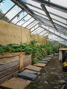The glasshouses sit on lime mortared stone walls with rubble trench foundations, contain stone walled beds, a pond, patio and a long area for staging for raising seedlings. Extensive stone walling around raised beds and a massive rammed earth retaining wall provide additional thermal mass to stabilise temperatures and keep it warm through the night. There are 4 peach trees and about 6 grape vines which also help create a micro climate in this very hothouse, retaining moisture in the soil and providing habitat and food. In 2014, its first growing year, the glasshouses yielded £3000 worth of tomatoes, cucumbers, salads, courgettes and sweetcorn. In West Wales, where summers are unpredictable and the growing season relatively short, the glasshouses are a gift from god. In 2017, we were blessed with over 500 peaches and 41 bunches of sweet grapes from the first mature vine and a winter of leafy greens and salads, easily thriving in the shelter with no maintenance.