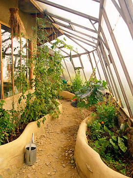 In 2013, having observed and learnt from the establishment of the buildings and gardens thus far, we embarked on building our large hobbit house, Earthlea, and of erecting 150m2 of reclaimed glasshouse. Although Earthlea is now gone, the building pad remains intact, and we’ll say more about its potential later. The glasshouses remain glorious, themselves a significant element intended to heat the big hoose. Built over a 9 month period, they hug the slope and are sited in the most sheltered position on the plot and have easily handled huge gales, whilst receiving the last of the afternoon sun, as observed over 9 years. They run north to south for a number of reasons, however it is significant that they are intended to allow the excess heat to move uphill by convection, into the thermal mass of the earthbag retaining wall of the house site. Passive ventilation or a simple heat exchange mechanism would transfer this heat to the main house, going much further towards year-round passive solar heating than the more common daily passive heat from sun facing windows. There is a deep pond behind the glasshouses to irrigate them; it currently captures rain water from the upper, aluminium glasshouse and is sited to utilise all the rainwater from the roof of the main house when it is rebuilt.