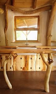 On the smallholding we have a small woodland, from which we were able to harvest all the timber we required for the building. I was apprehensive to start the build, as I’d never done anything like this before and didn’t really know where to begin, but with the persuasion of my old friend to “just start” and his ability to do just about anything, the site was cleared and the initial structure was raised. I had considered a few different designs for the house but when it came to it, it sort of designed itself. Using timber straight from the tree is an organic process, not really lending itself to straight lines, or too much pre planning. I was influenced by Simon Dale’s house at Lammas, and he gave me good advice, but much of the building was trial and error. Our budget was small and we wanted to use recycled and locally sourced materials as far as possible. It was important to us to make the house as energy efficient as we could, and to use natural materials when we could. There are many potentially carcinogenic materials used in conventional buildings, and we wanted to avoid using these. The following points highlight the main features of the house we ended up with: