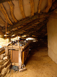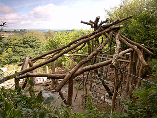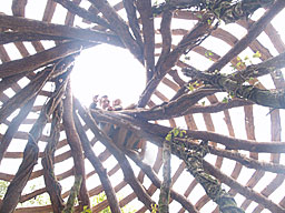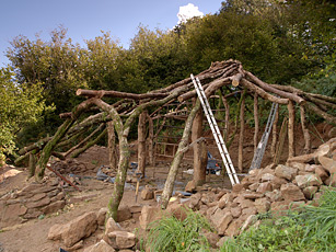 Once the posts and wall were up, a reciprocal roof was built on top. The reciprocal roof is fun and easy to make and ideally suited to round wood construction with a minimum of woodworking and structural complication (It doesn't push outwards on the walls and doesn't require tie beams). It also looks damn fine. Getting your head 'round it can be a bit tricky so i'd recommend having a go with a few small sticks before trying the real thing.