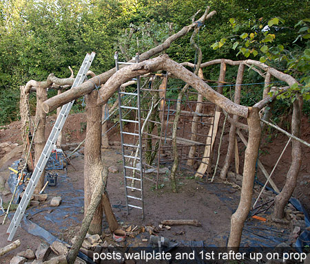 The frame is constructed from quite wiggly round oak logs 5"-10" in diameter. All of these were selected and felled from the surrounding woodland as part of an ongoing program of thinning to allow selected trees space to grow on to maturity.