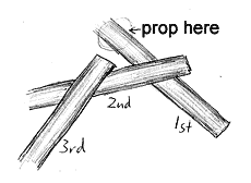 To make a reciprocal roof, the first rafter is propped up temporarily (as in picture above). The next rafter is then laid so that it sits on top of the first one. The third is then laid so it sits on the 2nd a little way down from where the 1st & 2nd cross. each rafter sits on another rafter below and has on sitting on top of it. This process continues all the way 'round until the last rafter just slips in underneath the first. The prop is then removed so the first rafter sits on the last one. Finally the rafters are fixed where they cross.